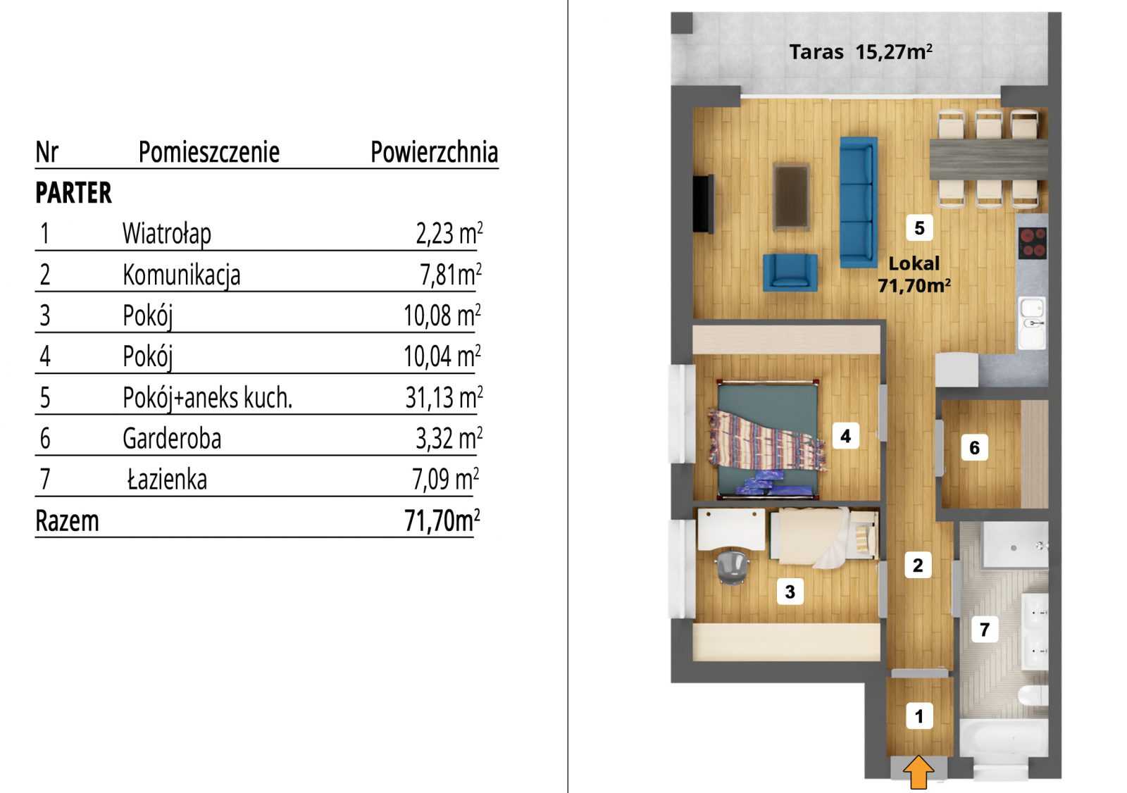 Powierzchnia: 71,70m2 Kondygnacja: Parter Ogród: ok. 72,87m2